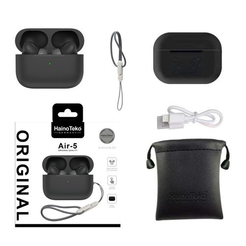 The Haino Teko Air-5 wireless earbuds deliver an exceptional audio experience with premium sound quality and deep bass. Designed for comfort and durability, they feature a lightweight build, ergonomic fit, and are sweat and water-resistant, making them ideal for workouts and daily use. With intuitive touch controls, seamless Bluetooth connectivity, and compatibility with both iOS and Android devices, these earbuds offer a hassle-free user experience. Enjoy up to 4 hours of continuous playback on a single charge, with an additional 8 hours provided by the compact charging case. The Air-5 comes with a free protective cover and hook for added convenience and portability.