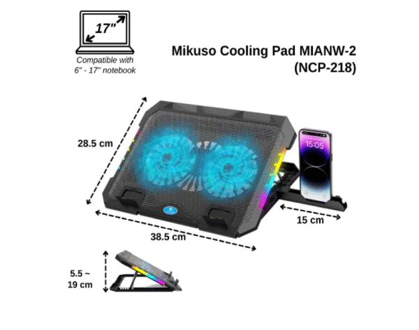 The Mikuso NCP-218 Miami-2 is an advanced laptop cooling pad designed to enhance your computing experience. With its dual-fan system, ergonomic design, and RGB lighting, it ensures optimal airflow and comfort during extended laptop use.