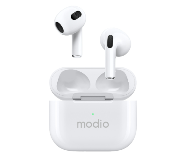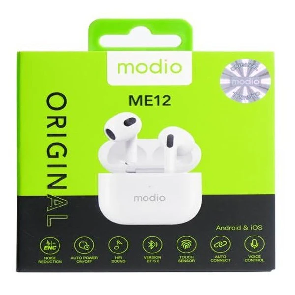 Modio ME12: Bluetooth 5.0 true‑wireless earbuds with 3‑hour playtime, 100‑hour standby, and a 360 mAh charging case.