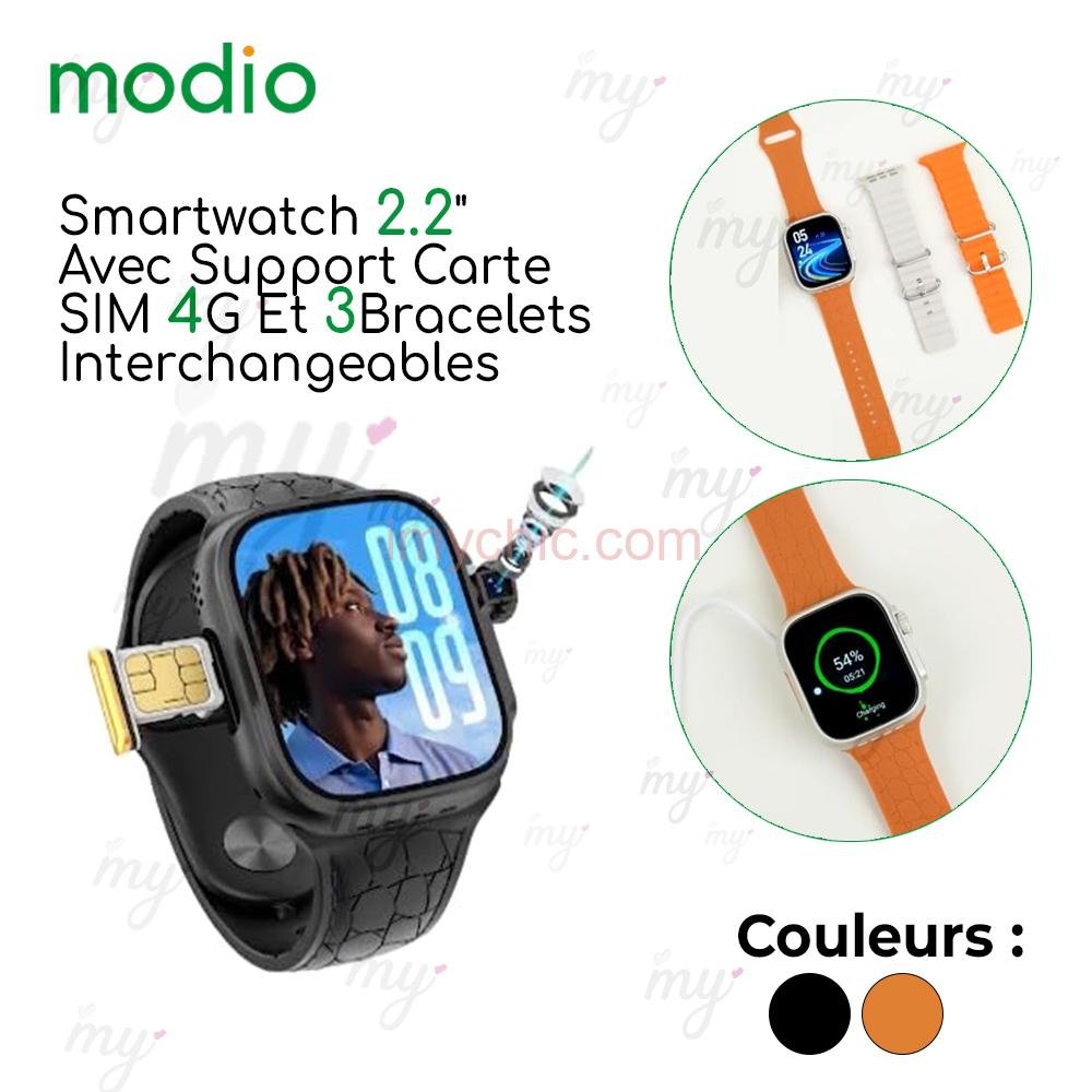 Modio ST-13 Smartwatch with 2.2″ full-screen display, 4G SIM support, camera, and 3 interchangeable straps.