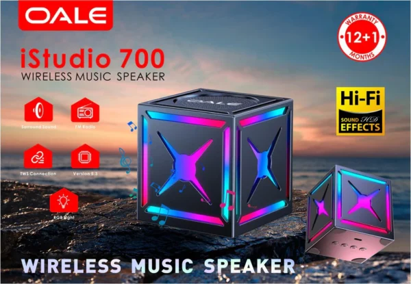 OALE iStudio 700 – A compact RGB-lit wireless speaker (≈263g) delivering ~4 hrs of bass-rich sound.