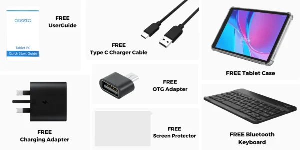 Oteeto Tab 8 – compact 8″ Android tablet with 8 GB RAM, 256 GB storage, plus 5G/WiFi, a 5000 mAh battery and vibrant IPS display — great for portability and performance.