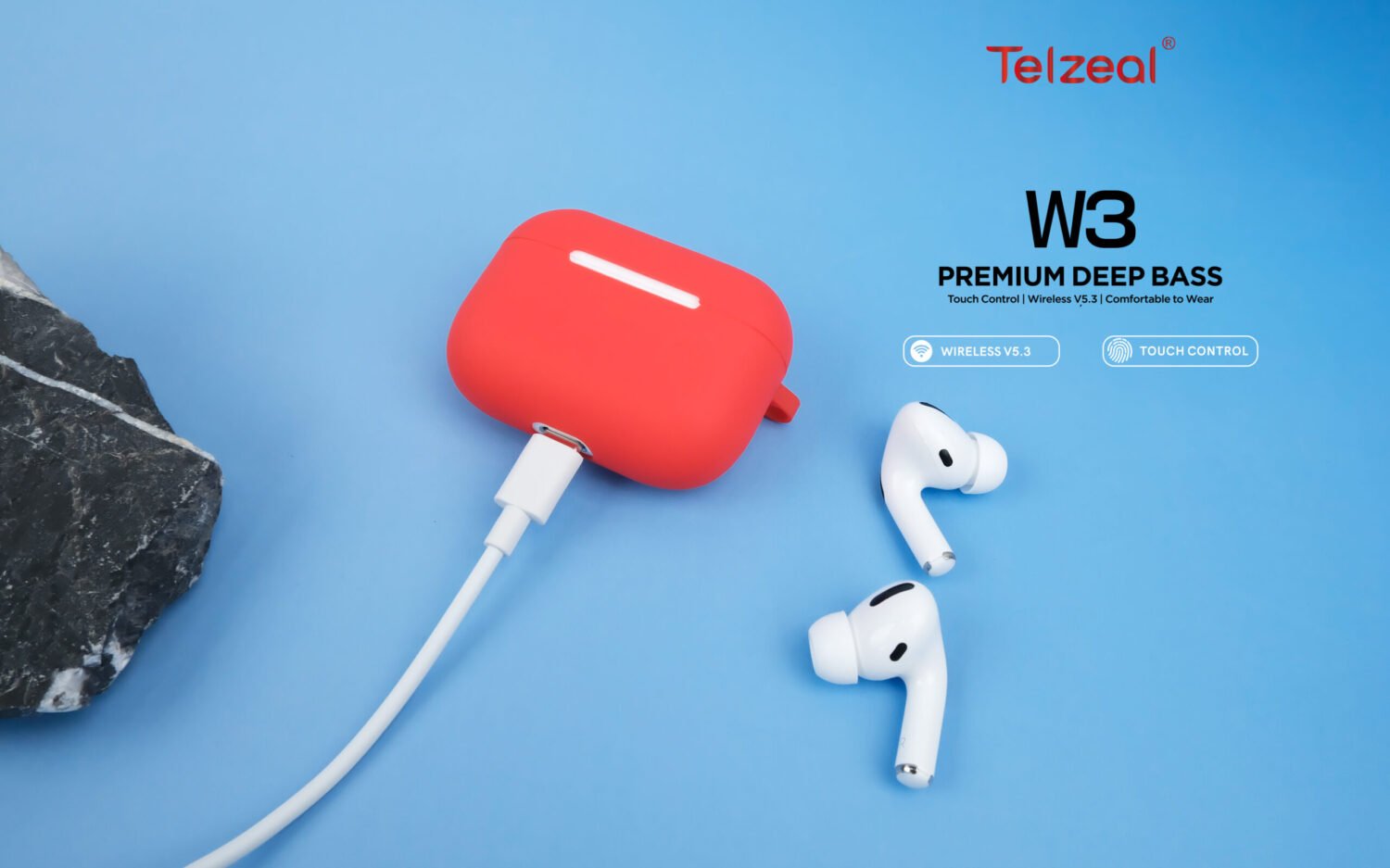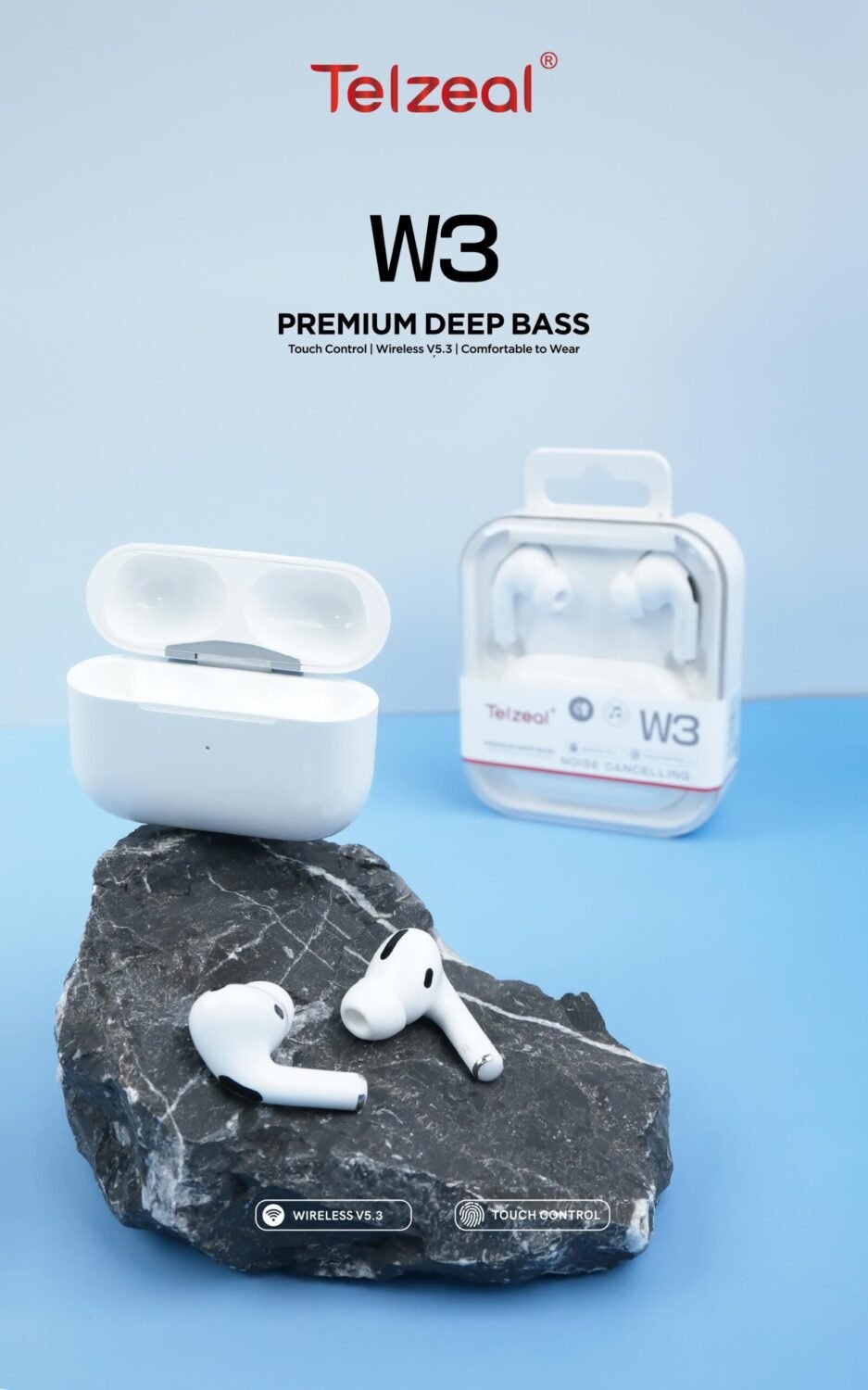 Telzeal W3 are true wireless earbuds featuring Bluetooth 5.3, touch controls, two microphones for AI-enhanced calling, and built-in noise cancelling with deep bass sound.